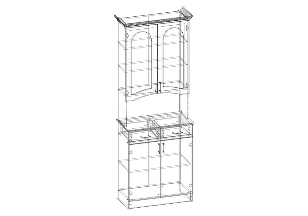 Верхние витринные полки рассчитаны на вес до 3 кг. Высота открытой ниши 35 см.